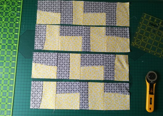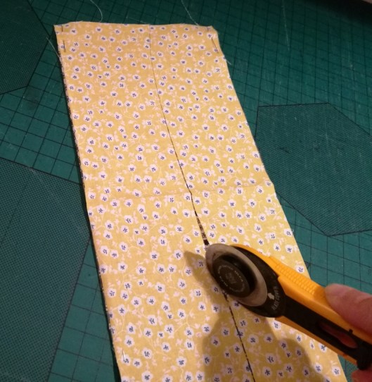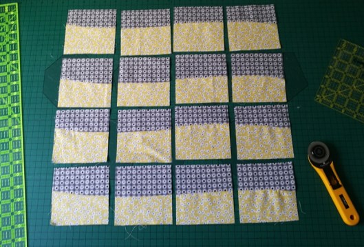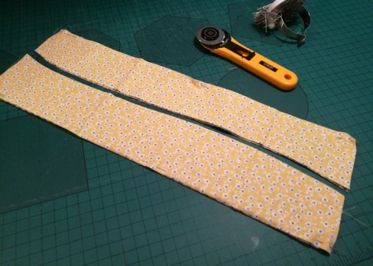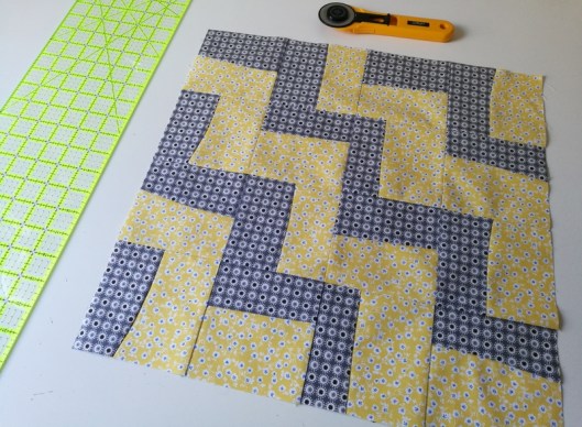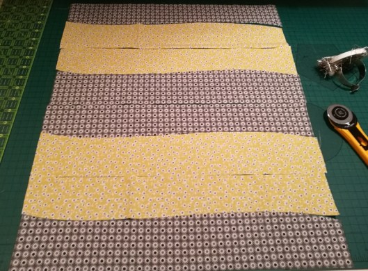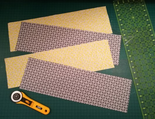 Pilar nous a donné carte blanche question tissus : il fallait juste choisir deux tissus qui nous plaisaient bien et qui avaient un fort contraste. J’ai donc coupé ces deux bandes :