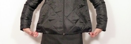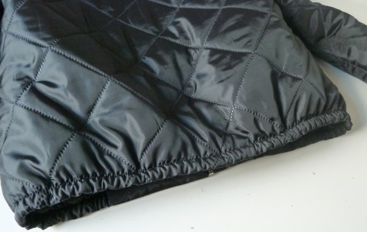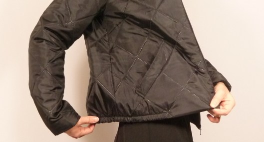 3/ Pour éviter les courants d’air dans le dos, j’ai souhaité resserrer/recintrer un peu la veste. Pour ce faire, j’ai ajouté un élastique au bas de ma veste :