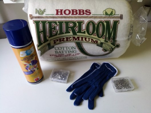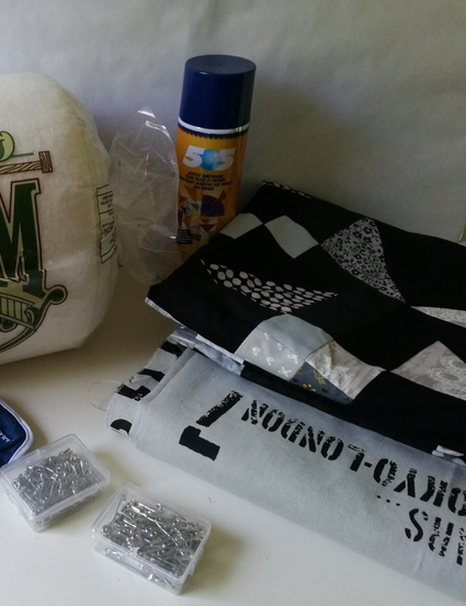 J’ai ensuite acheté tout le matériel nécessaire pour passer à l’étape « sandwich » et « matelassage » : du molleton, de la colle temporaire, des gants et des épingles :
