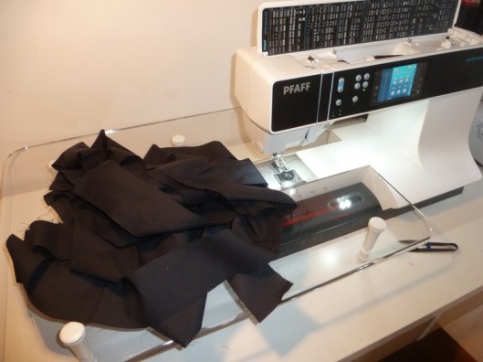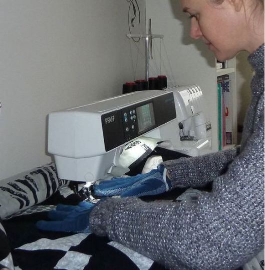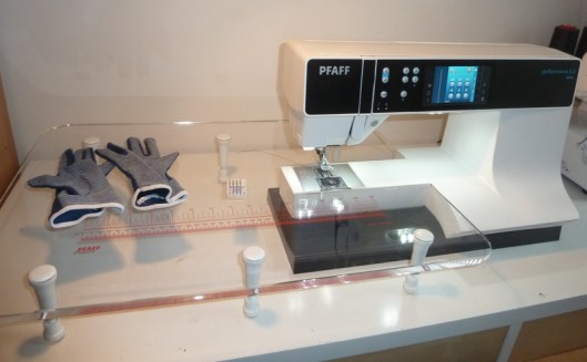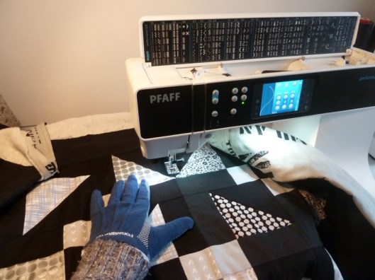 Pour ce faire, j’ai sorti ma table d’extension, mes gants et mes aiguilles spécial quilting :