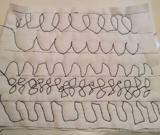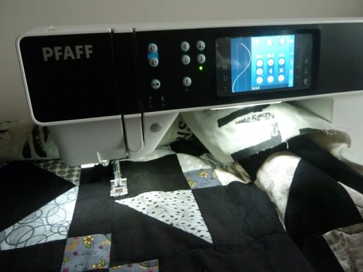 J’ai sélectionné un point fantaisie de ma machine : une vague que j’ai placée à égale distance dans la longueur et dans la largeur de mon quilt… Je n’ai pas fait beaucoup de lignes car j’ai trouvé l’exercice plutôt difficile : très vite, j’ai eu mal au dos et des crampes au niveau des mains… Bref, je devais être très certainement mal positionnée et pas assez décontractée…