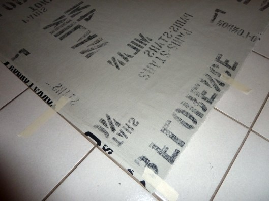 On pose au sol le tissu arrière, envers face à nous. De ce que j’ai compris, il doit être plus grand en longueur et en largeur par rapport au molleton et au quilt top. On le tend bien puis on le fixe au sol grâce à du scotch (ici du scotch qu’on utilise en peinture et que je trouve plus résistant que du masking tape) :