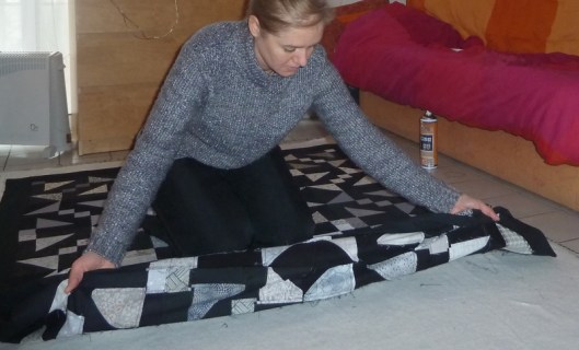 Une fois le molleton fixé, j’ai positionné par-dessus mon quilt top en procédant de la même manière :