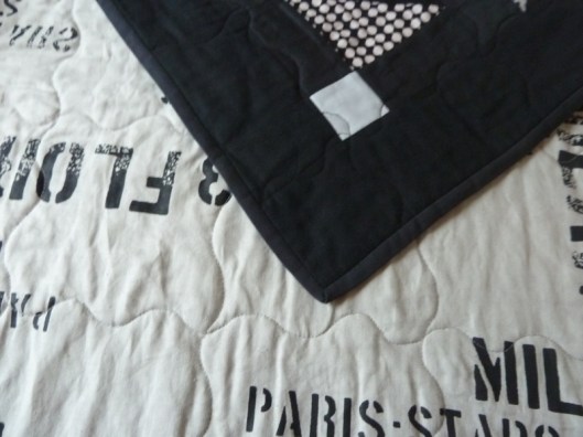 Pour le tissu arrière, j’ai utilisé un coupon que m’avait généreusement offert Stop Tissu et que je trouvais parfait pour le dos de mon quilt.