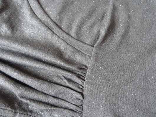 Le patron est proposé en 8 tailles du 34 au 48. J’ai pour ma part cousu la taille 36 : c’est bon pour la carrure mais un peu trop large au niveau du ventre et des hanches. Les fronces placées sur le côté et qui donnent du drapé au décolleté n’avantagent pas forcément la silhouette, attention, donc !