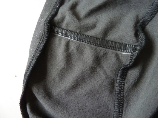 Il y a juste un point des explications que je n’ai pas suivi : celui du colletage. J’ai en effet préféré ajouter une bande rapportée en guise de finitions pour l’encolure/décolleté plutôt que de coudre un biais : faire de jolies surpiqûres sur du jersey et qui plus est sur un biais est à mon avis des plus risqués. Vous l’aurez compris, j’ai donc jouer la sécurité en posant cette bande qui est tout simplement la technique qu’on utilise pour coudre une encolure de t-shirt.