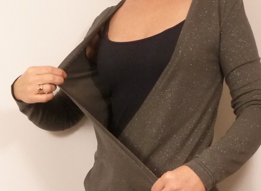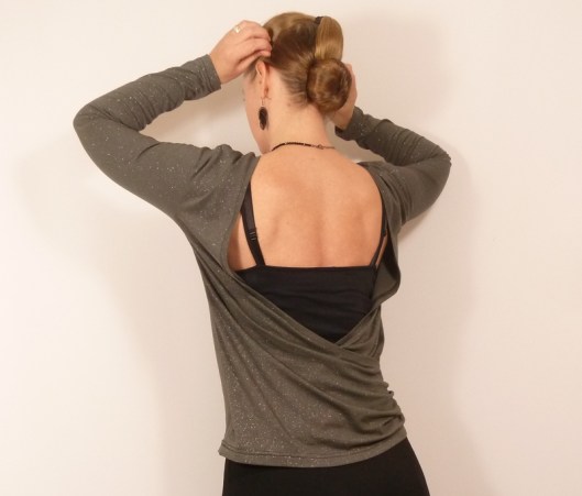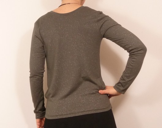 Vous n’avez vu jusqu’à présent que la version Day avec le décolleté au devant : je le porte ici avec un débardeur et j’aime bien le rendu. J’ai également porté ce top avec un sous-pull est j’ai beaucoup aimé. Ce top se comporte donc comme une sorte de gilet. Voici une vue du dos :