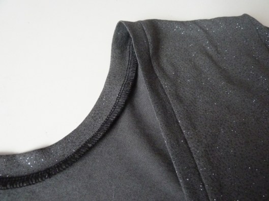 Il y a juste un point des explications que je n’ai pas suivi : celui du colletage. J’ai en effet préféré ajouter une bande rapportée en guise de finitions pour l’encolure/décolleté plutôt que de coudre un biais : faire de jolies surpiqûres sur du jersey et qui plus est sur un biais est à mon avis des plus risqués. Vous l’aurez compris, j’ai donc jouer la sécurité en posant cette bande qui est tout simplement la technique qu’on utilise pour coudre une encolure de t-shirt.