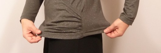 Le patron est proposé en 8 tailles du 34 au 48. J’ai pour ma part cousu la taille 36 : c’est bon pour la carrure mais un peu trop large au niveau du ventre et des hanches. Les fronces placées sur le côté et qui donnent du drapé au décolleté n’avantagent pas forcément la silhouette, attention, donc !