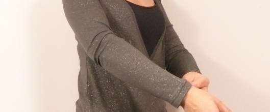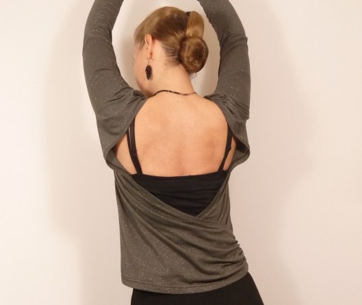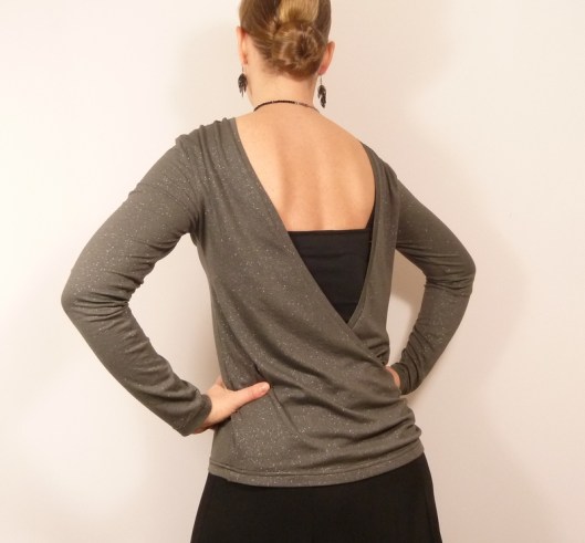 Vous n’avez vu jusqu’à présent que la version Day avec le décolleté au devant : je le porte ici avec un débardeur et j’aime bien le rendu. J’ai également porté ce top avec un sous-pull est j’ai beaucoup aimé. Ce top se comporte donc comme une sorte de gilet. Voici une vue du dos :
