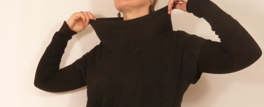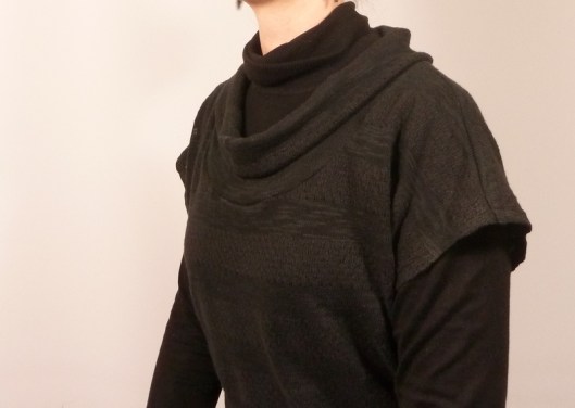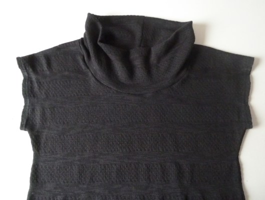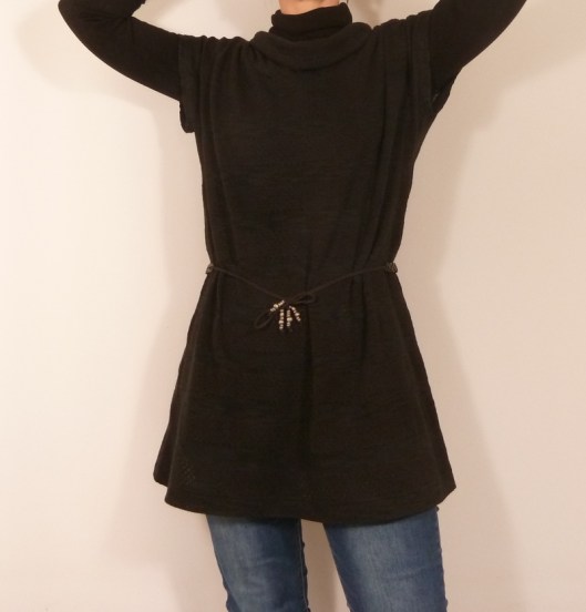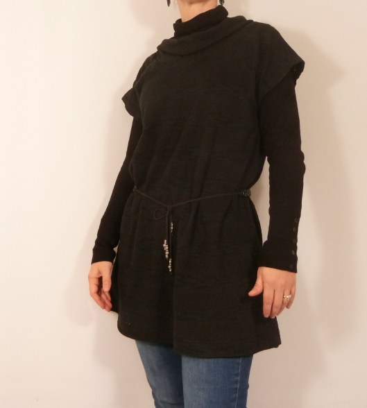 Pour ma version, j’ai choisi d’épurer au maximum cette tunique tout simplement parce que je n’avais pas assez de tissu : je n’ai donc pas cousu les manches, le col a été rétréci et je n’ai pas mis de lien de serrage.