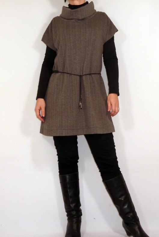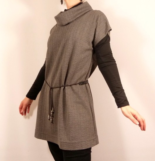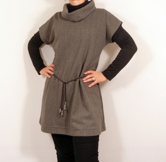 Côté réalisation, rien de plus simple : un devant, un dos et un col à assembler à la surjeteuse. Restent les ourlets des manches et du bas de la tunique et comma d’habitude, je les ai réalisé à la recouvreuse :