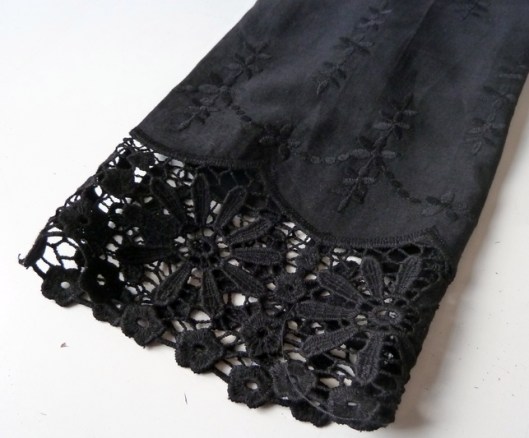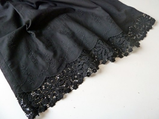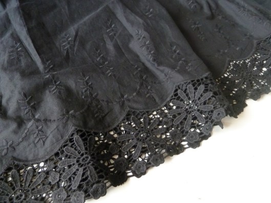 Le tissu choisi est un voile de coton dont le bord est festonné avec de la dentelle. Je trouve ce tissu absolument magnifique ! Je l’ai acheté vraiment pas cher, aux coupons de St Pierre dans la boutique Modes & Travaux près de Saint-Lazare :