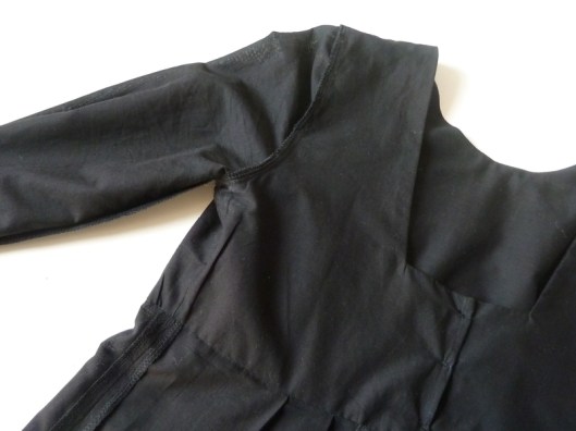 Je signale toutefois que le corsage est assez ajusté au niveau de la carrure, je m’en rends compte quand je bouge le haut du corps… je me sens un peu étriquée… Il est d’ailleurs précisé qu’il faut choisir, pour la version A, un tissu avec un minimum de souplesse. Je comprends mieux pourquoi.