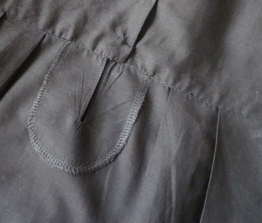 J’ai fait une petite modification au niveau de la jupe dos : j’ai mis ma pièce dos au pli du tissu pour éviter d’avoir une couture d’assemblage au milieu dos (je voulais en effet garder ma dentelle intacte…) Et comme il fallait une ouverture dans le haut de la jupe dos, j’ai donc dû créer une petite fente passepoilée :