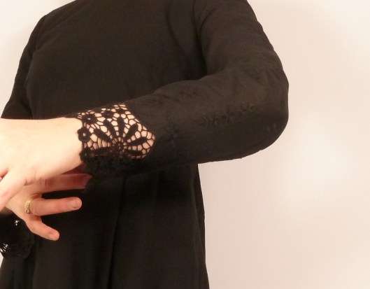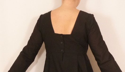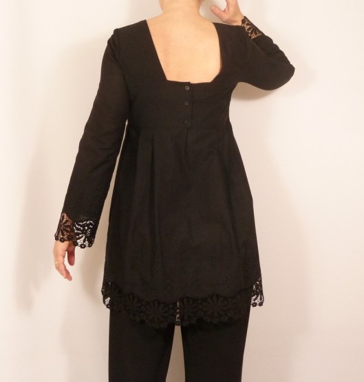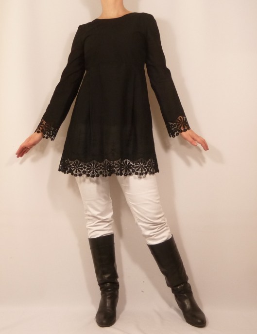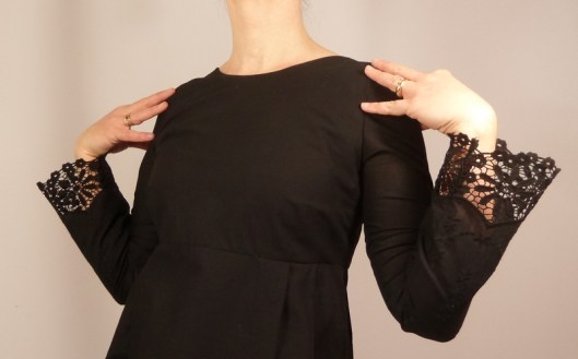 Sauf que… et c’est à l’essayage que je m’en suis rendu compte : qui dit robe taille empire, dit corsage qui s’arrête sous la poitrine… Donc la tunique reste très transparente sur un bonne partie ! Conséquence : port d’un débardeur noir obligatoire ! Il aurait donc fallu je pense que je double entièrement la robe… à voir si j’ai un jour j’ai le courage de le faire…