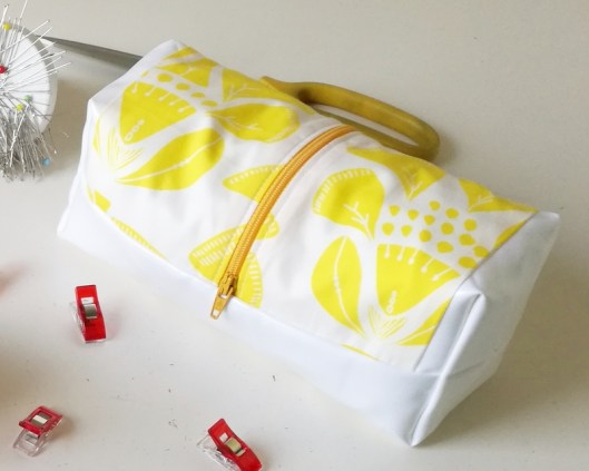 Il s’agit donc ici d’un patron maison. J’ai utilisé pour le fond du sac du simili cuir fin blanc et pour le corps du sac un tissu jaune de mon stock.