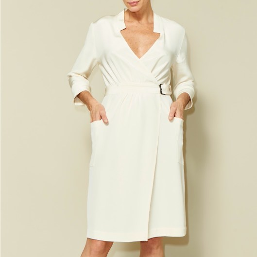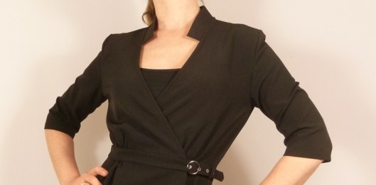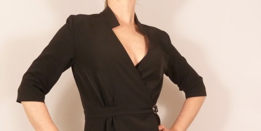 Voici le modèle de présentation : une robe portefeuille ajustée à la taille et fermée par une ceinture. A noter de jolies fronces au niveau du corsage (devant et dos) et de la jupe (devant et dos), un col droit, des manches 3/4 finies par un bracelet de manche et des poches plaquées sur la partie jupe.