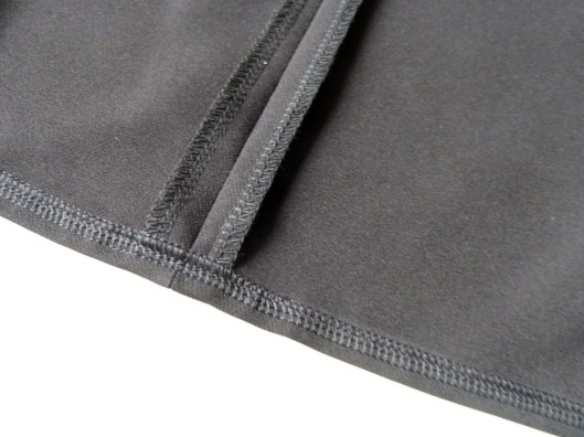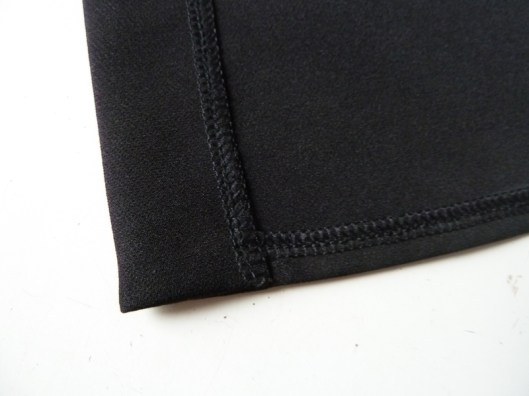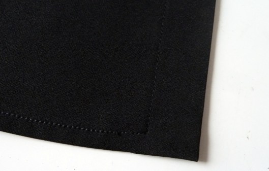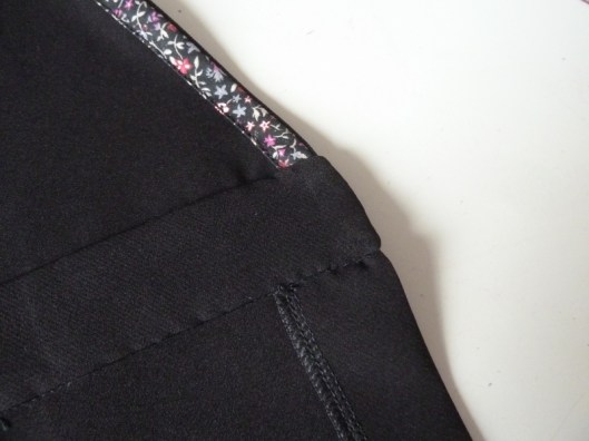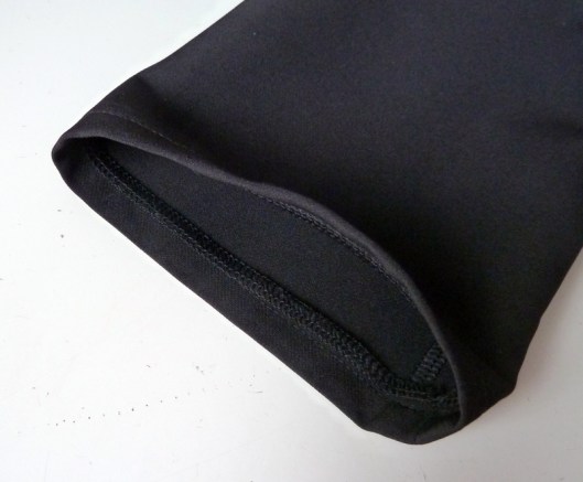 Par manque de tissu, mes manches ne sont donc pas finies par un bracelet de manche. J’ai réalisé à la place un simple ourlet surjeté.