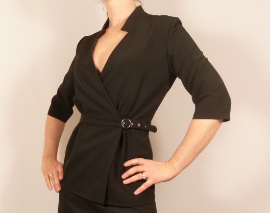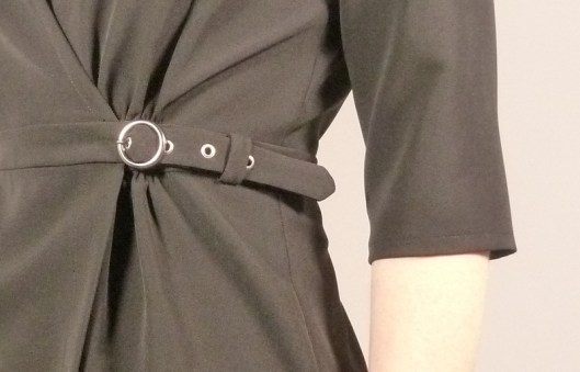 Voici le modèle de présentation : une robe portefeuille ajustée à la taille et fermée par une ceinture. A noter de jolies fronces au niveau du corsage (devant et dos) et de la jupe (devant et dos), un col droit, des manches 3/4 finies par un bracelet de manche et des poches plaquées sur la partie jupe.