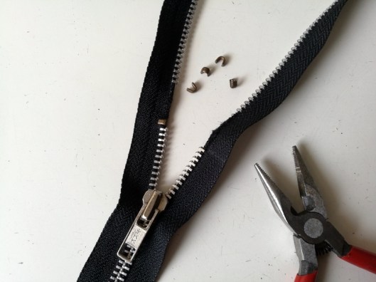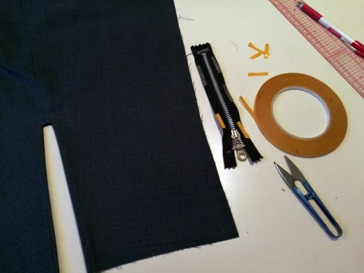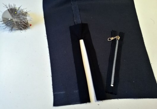 Plutôt que de bâtir à la main le zip au bord de la fente, je le fixe avec du ruban double-face :