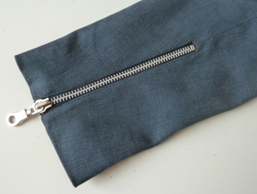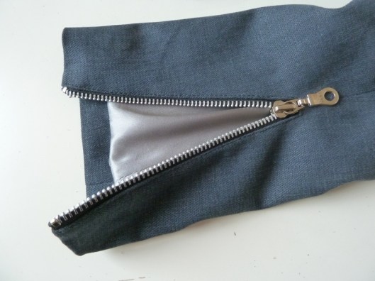 Le bas des manches est fini par une fente zippée doublée. La technique, que la prof propose, est simplifiée : le zip est tout simplement fixé à l’ouverture. J’ai pour ma part préféré coudre une fente passepoilée. C’est d’ailleurs la technique utilisée par Pauline-Alice pour le Quart coat : j’ai donc suivi cette dernière pour coudre mes fentes zippées. La doublure est fixée ensuite à la main tout autour du zip, ce que j’ai fait.