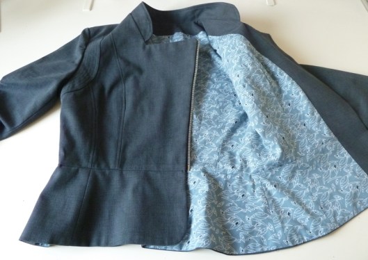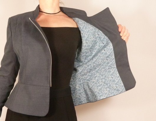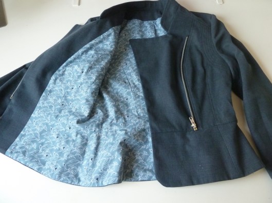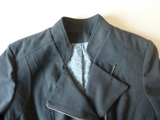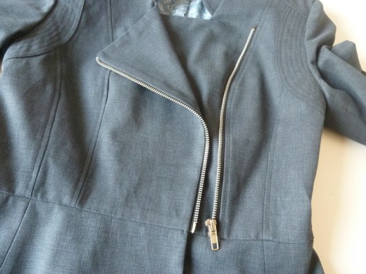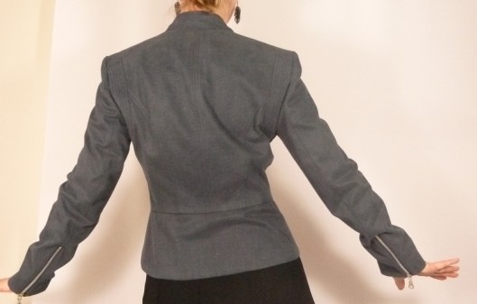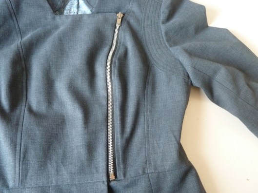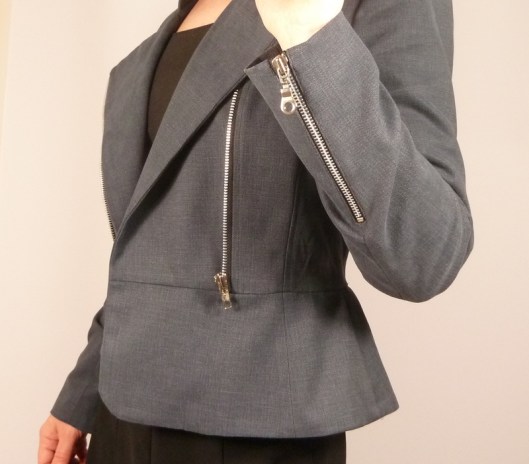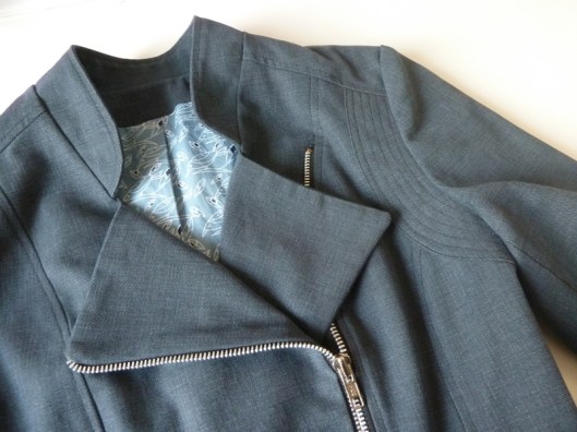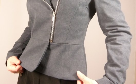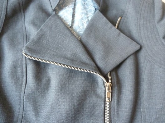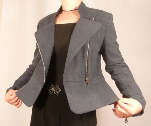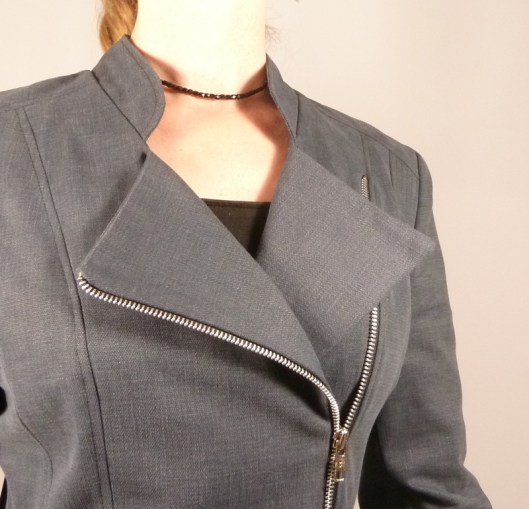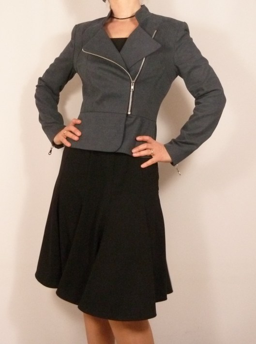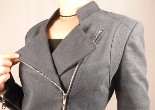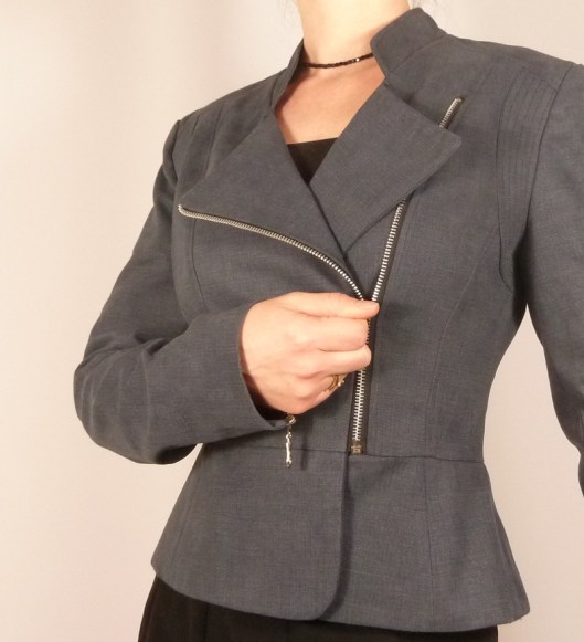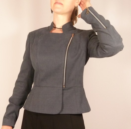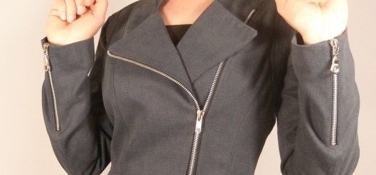 C’est donc la première veste que j’ai cousue : une veste féminine cintrée à la taille avec basques et jolies découpes devant et dos. Autres détails : col droit, veste style biker/perfecto avec fermeture zippée au devant et aux extrémités des manches.