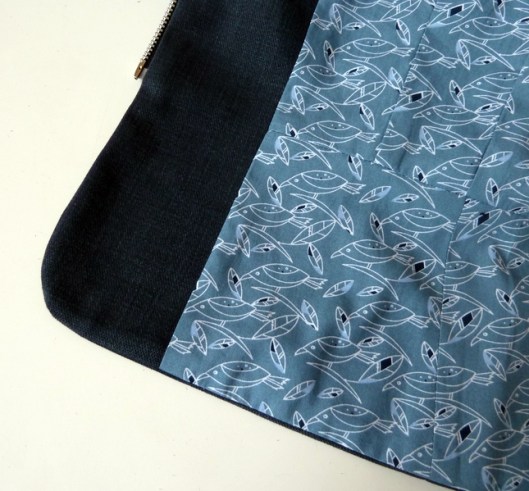 Le modèle prévoit l’utilisation de deux matières différentes, notamment du simili-cuir pour mettre en valeur certaines découpes. Pour ma part, j’ai tout cousu dans le même tissu mais j’ai tout de même souligné les découpes arrondies en faisant des surpiqûres (qui sont d’ailleurs proposées dans le cours) :