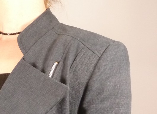 Le col droit, je l’adore ! Il est prix en sandwich entre le tissu extérieur et la parementure (autrement dit très facile à coudre):
