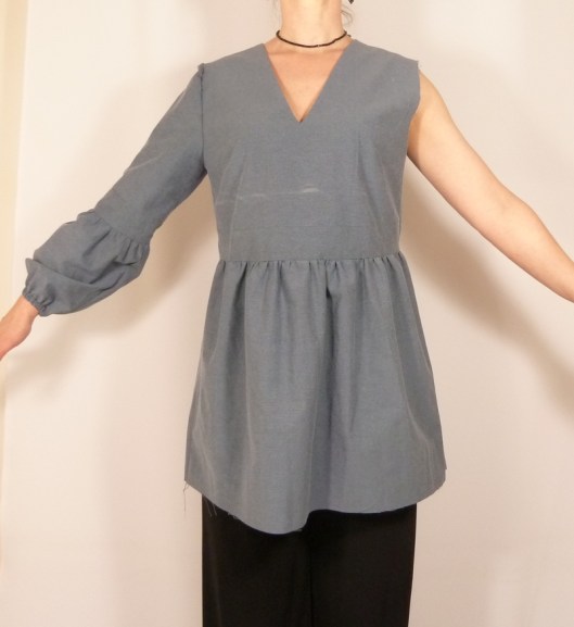 Je ne parlerai évidemment pas de patronage ici, je ne vous dirai donc pas comment j’ai procédé pour obtenir ce patron, histoire de respecter le travail effectué par la créatrice. Toujours est-il qu’après avoir effectué mon patron, j’ai souhaité réalisé une toile pour vérifier entre autres les proportion, l’aisance apportée à cette tunique, le placement des découpes…