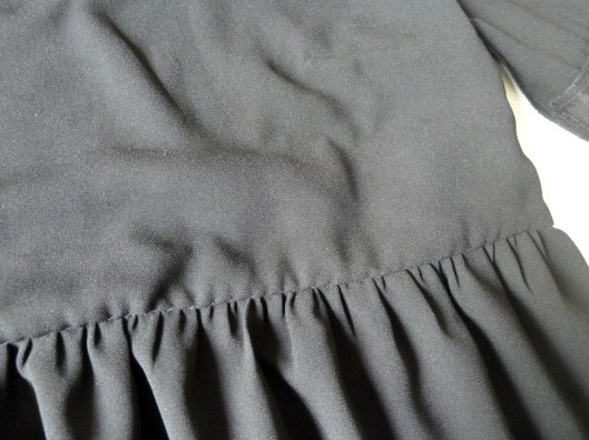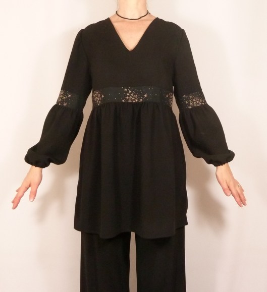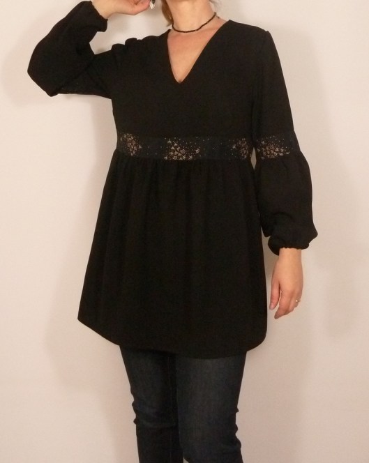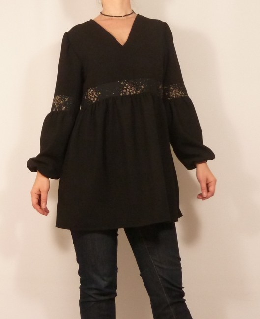 Le tissu choisi est un crêpe noir fin, souple et fluide comme j’aime. Pour éviter le côté femme enceinte ou montgolfière, il faut en effet privilégier des tissus fins comme le crêpe, la viscose, le voile de coton… J’ai utilisé mes chutes de tissu Atelier Brunette pour les empiècements et j’aime beaucoup l’association de ces deux tissus :