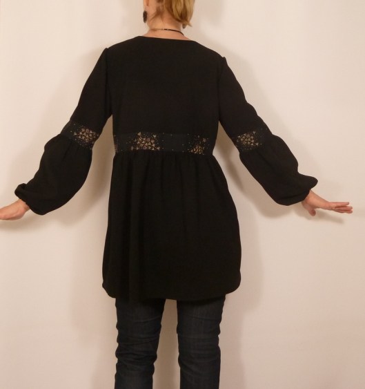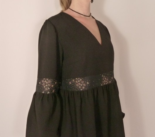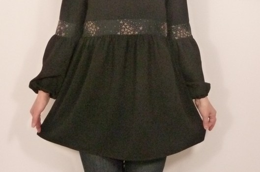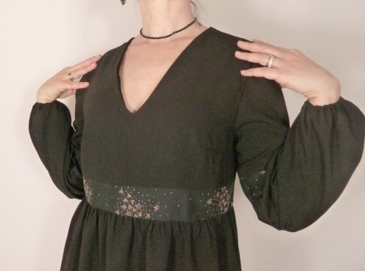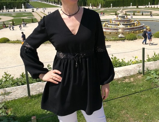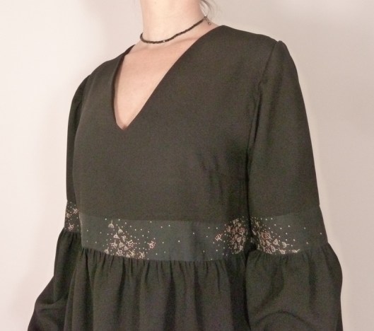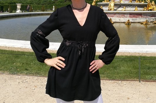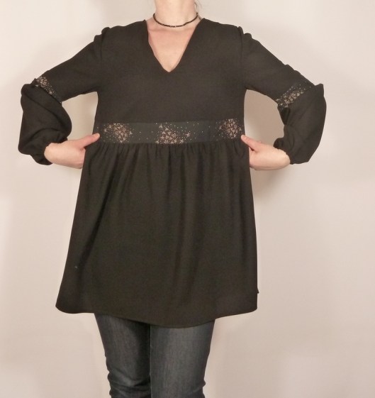 Edit du 9 mai 2018 : après avoir porté une journée entière cette tunique, l’évidence était bel et bien là : pas assez à l’aise, tunique trop ample à mon goût… J’ai donc fini par resserrer la tunique sous la poitrine grâce à un élastique que j’ai placé au dos. Le devant est fini par un lien à nouer. Je préfère nettement le résultat, c’est plus esthétique & confortable :