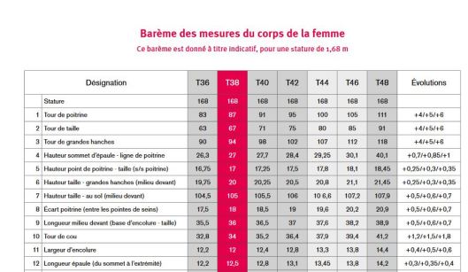 La 1ère fiche nous indique notamment le tableau des tailles.