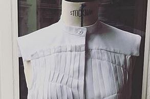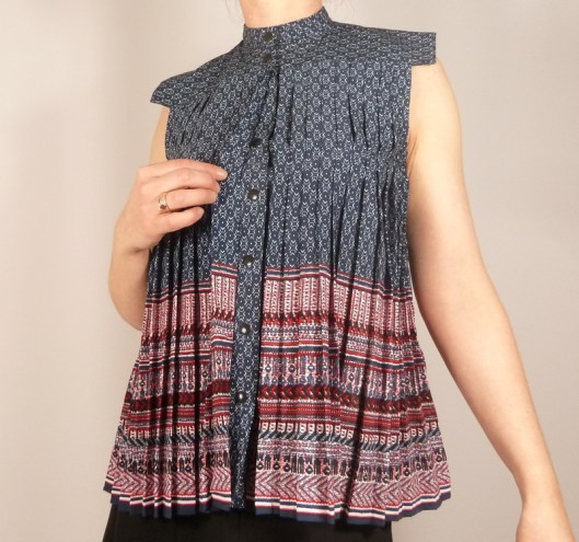 « Cette chemise sans manche, formée sur le devant par des plis maintenus par des galons est du plus bel effet, portée. Il vous faudra un peu de patience pour réaliser cet ensemble de plis, de préférence dans une matière première majoritaire en polyester (cela n’est pas une obligation pour ce modèle, car des galons viennent bloquer l’ensemble de ces plis). Pour le choix des tissus, choisissez des matières plutôt fluides, pour garder de la souplesse à cette chemise, qui doit rester avant tout confortable ».