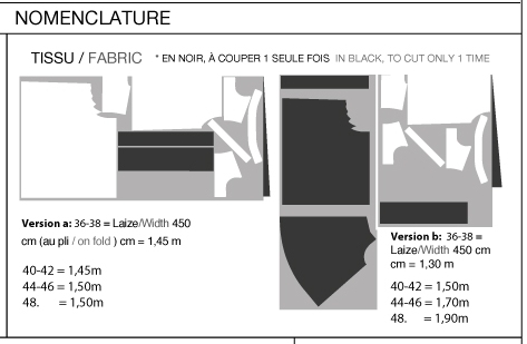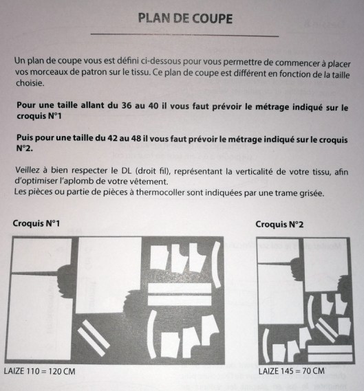 Ensuite, je me suis intéressée au tissu et au métrage nécessaire pour coudre ce top plissé. Le plan de coupe est aussi étrange que pour celui du bombers : il y a un croquis qui nous signale que si on veut coudre la taille 36 par exemple, il faut alors se référer au croquis n°1 qui nous indique qu’il faut prendre une laize de 110 cm… la laize de 145 cm ne semble réservée qu’aux tailles 42-48. Etrange, non ?!… En tout cas, ce qui est certain c’est que les pièces du patron ne tiennent pas du tout sur le métrage indiqué : 70 cm sur une laize de 145 c’est nettement pas assez !