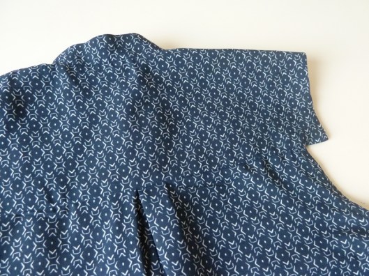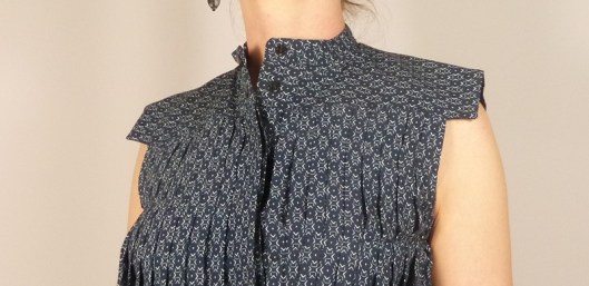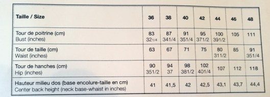 A noter qu’il n’y a pas de tableau des mesures finies du vêtement. C’est dommage car ça nous permettrait de nous rendre compte de l’aisance apportée au modèle. J’ai choisi la taille 36 pour mon 36 habituel et la tunique tombe bien sur moi. Le top n’est pas aussi loose que ce que je pensais. Je regrette juste que n’apparaisse pas dans le tableau, la mesure du tour de cou car, comment dire… quand je boutonne ce top plissé, je suis comme étranglée… Il ne me semble pourtant pas avoir un cou trapu ou hors norme…
