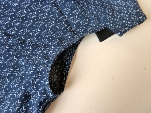 Les emmanchures sont finies avec un biais rapporté coupé dans le même tissu :