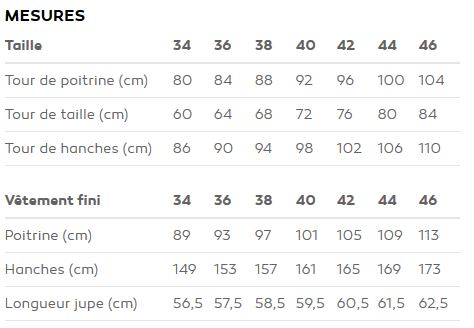 Le patron est proposé de la taille 34 à 46. J’ai choisi la taille 36 et elle tombe parfaitement sur moi. Le tableau des mesures du vêtement fini permet en effet de se rendre compte de l’aisance apportée au patron.