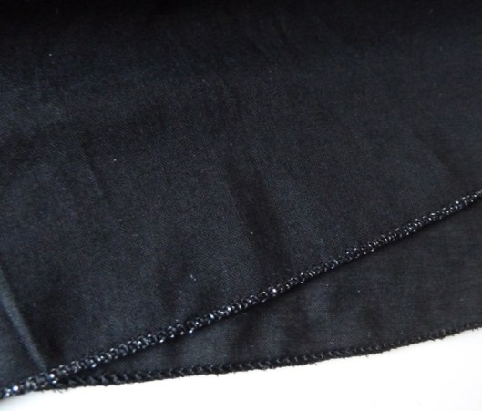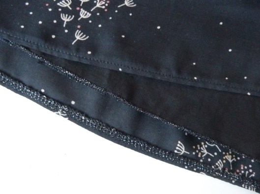 En ce qui concerne l’ourlet du bas de la doublure, j’ai eu envie de réaliser un ourlet roulotté avec ce même fil argenté. J’aime beaucoup le résultat !
