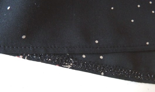 En ce qui concerne les ourlets de manches, de doublure et de bas de robe, Il est préconisé de faire un ourlet de 5mm replié sur lui-même. J’ai pour ma part fait un simple ourlet surjeté puis surpiqué pour le bas de ma tunique.