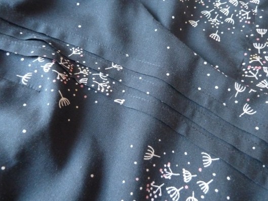 Le design de ce tissu est absolument à tomber. Il est en effet très rare que je tombe en amour comme ça avec un tissu. Celui-ci est indiqué comme étant du modal (le modal est très proche de la viscose). Qui dit modal, dit tissu souple, léger, fuyant, difficile à gérer… J’ai donc utilisé du Fabulon pour faciliter la formation des plis.