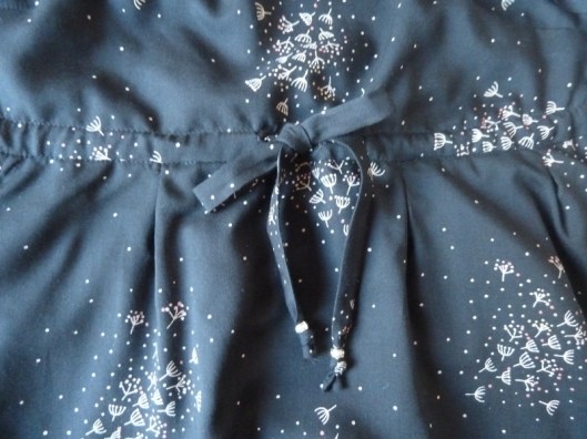La robe est resserrée sous la poitrine par un lien à nouer : c’est à mon sens une des parties les plus techniques de la robe : former cette coulisse demande minutie et précision (tout comme les plis d’ailleurs).