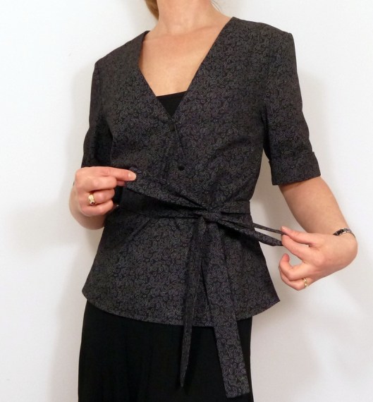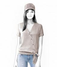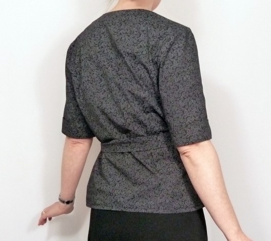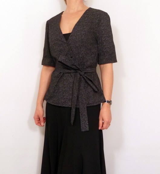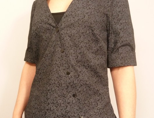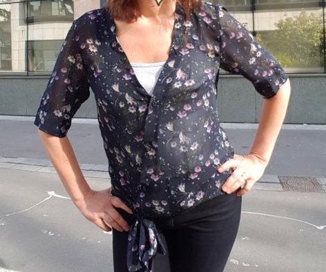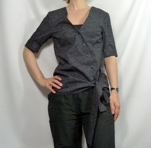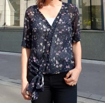 Voici l’illustration proposée par Lekala, laquelle je trouve, rend vraiment bien : une blouse asymétrique fermée au devant par des boutons et un lien à nouer pour faire blouser la chemise. Autre détail : un joli décolleté en v et des manches courtes finies par un revers :