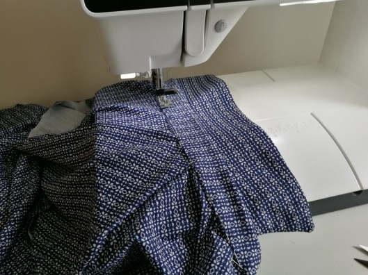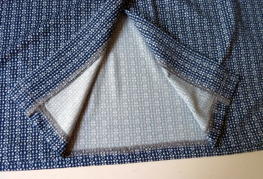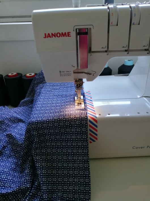 Pour les finitions du bas du chemisier, j’ai choisi de coudre un ourlet simple surjeté. La piqûre (1 seule aiguille) a été faite grâce à ma recouvreuse. Sur cet imprimé on ne voit pas grand chose…