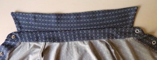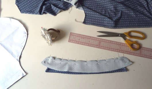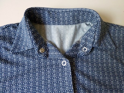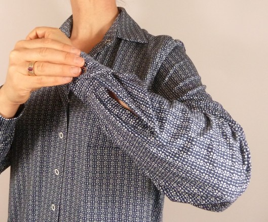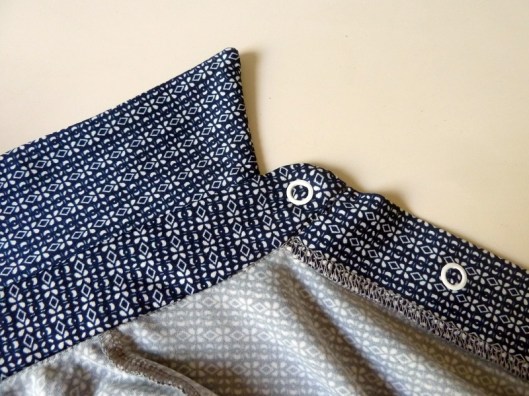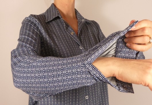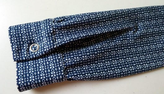 Pour rigidifier un peu le tissu et donc faciliter la couture, j’ai entoilé les parties suivantes : pattes de boutonnage, pied de col et col, poignets, fentes indéchirables.