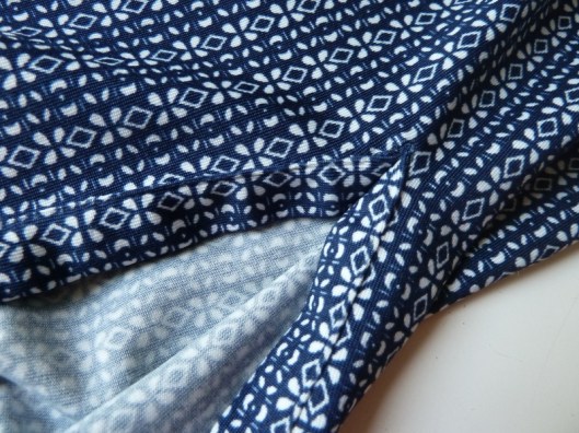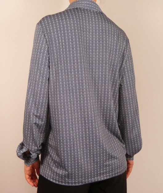 Le tissu que m’a confié ma mère est un tissu de type jersey moyen (190 g/m2) imprimé de motifs géométriques écrus sur fond bleu marine (96% Polyester et 4% Elasthanne).