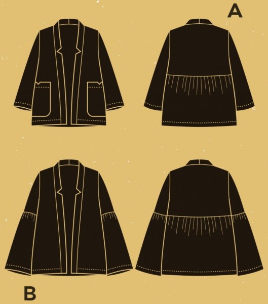 Parlons à présent de la veste Nénuphar de Deer & Doe : patron que je n’ai pas acheté mais dont je me suis fortement inspirée ! Voici la description faite par la créatrice : « Veste courte façon kimono avec fronces au dos. Version A manches ¾ et poches plaquées, version B manches longues froncées. »