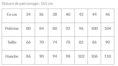 Pour information, il n’y a pas de tableau avec les mesures du vêtement fini. On ne sait donc pas (à moins de mesurer le patron) qu’elle est l’aisance apportée au modèle. Petite remarque au passage, le tour de taille chez RDC est plus grand que ce qu’on a l’habitude de voir chez les autres créateurs/patrons. Le tour de taille 36 chez RDC est de 70 cm, chez Deer & Doe c’est 64 cm, soit une différence de 6 cm tout de même… Bref chez RDC la taille n’est pas très prononcée. Ivanne Soufflet avait d’ailleurs rédigé il y a quelques années un article fort intéressant sur « Une histoire de TAILLE et de BIEN-ALLER » : « la « silhouette-type » la plus récente de Géraldine présente donc une morphologie à la taille moins marquée, plus « droite » (+ rectangle)… »