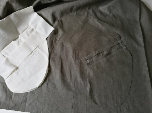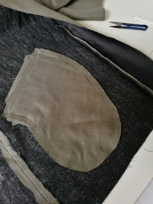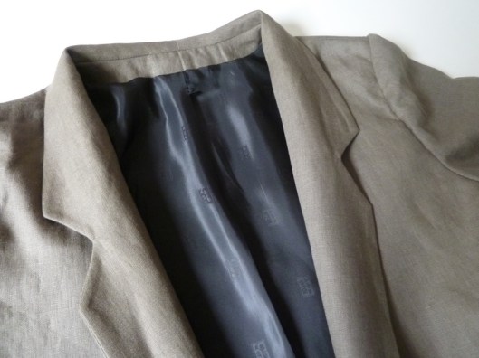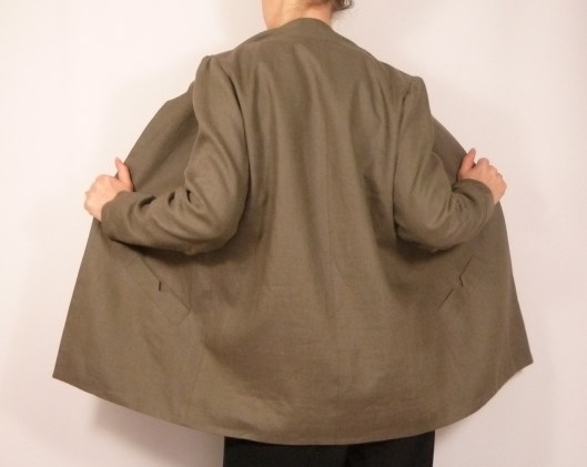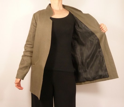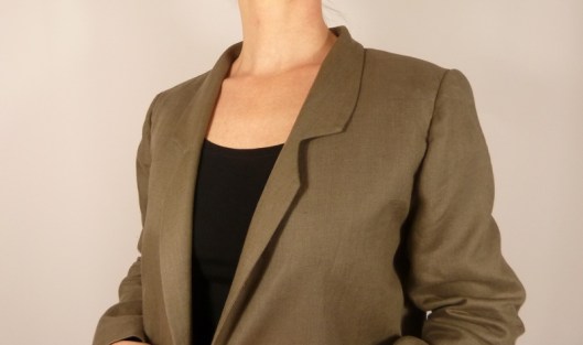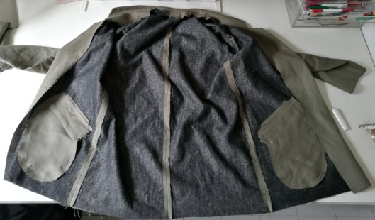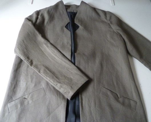 Ce lin n’étant pas à l’origine prévu pour réaliser une veste, j’ai donc préféré entoiler complètement toutes les pièces du patron, histoire que mon lin ait une meilleure tenue. Ci-dessous voici ma veste avant la pose de la doublure :