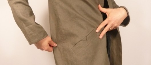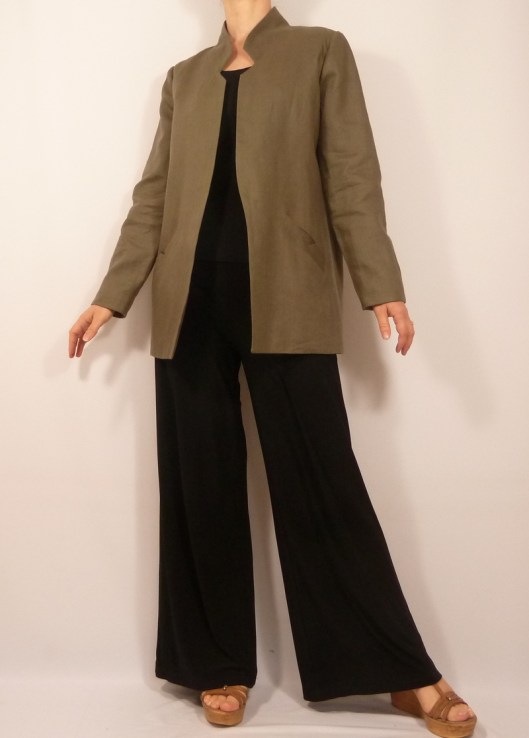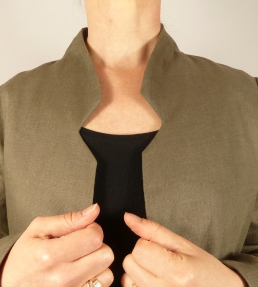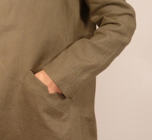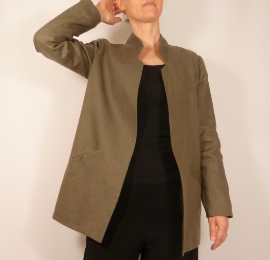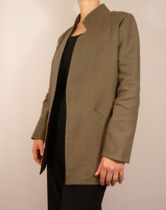 Vous l’aurez compris, j’ai adoré le détail du col cranté de la veste Nénuphar, je l’ai donc repris ! Après cette version hiver, j’avais donc très envie d’avoir une version printemps/été/automne. J’ai donc choisi du lin que j’ai acheté à Paris dans la boutique Modes & travaux (30€ les 3 mètres). Il apparait ici marron mais en fait il est bien kaki !